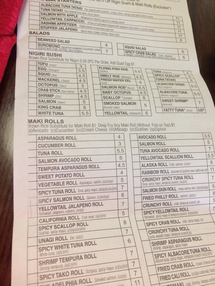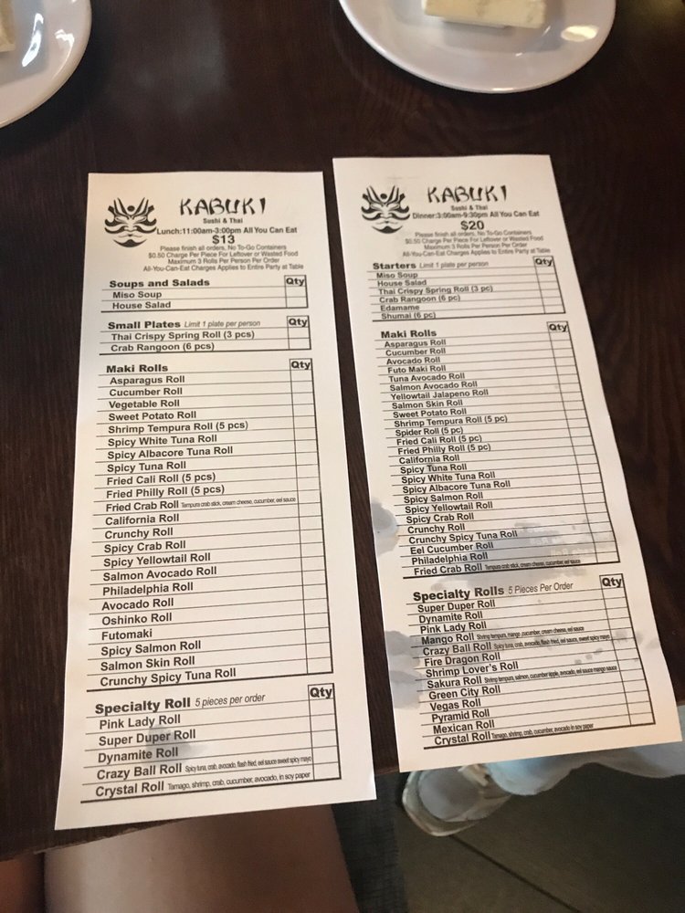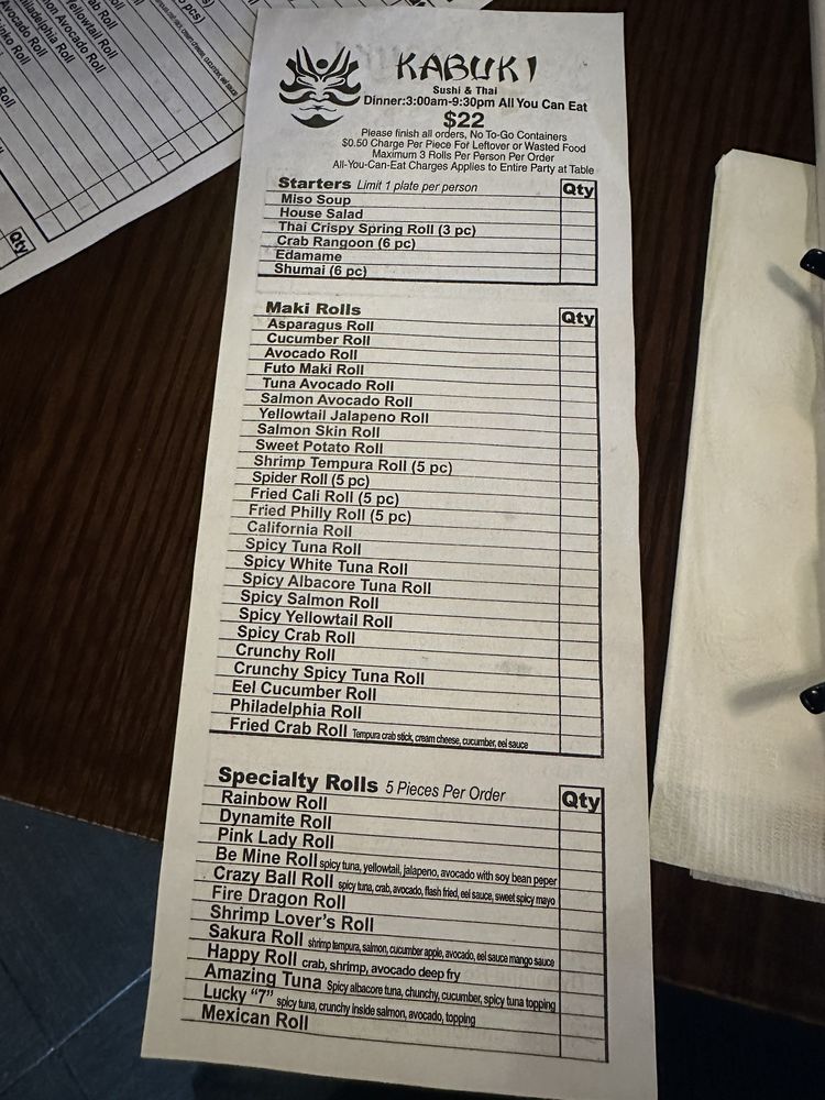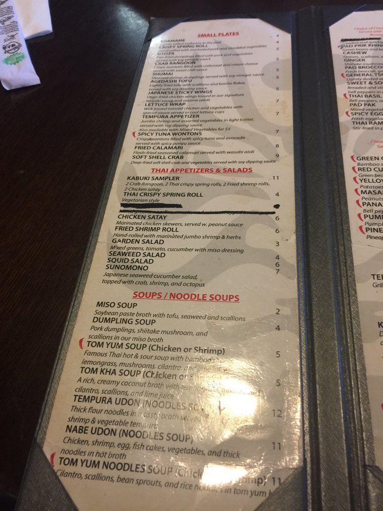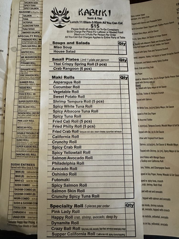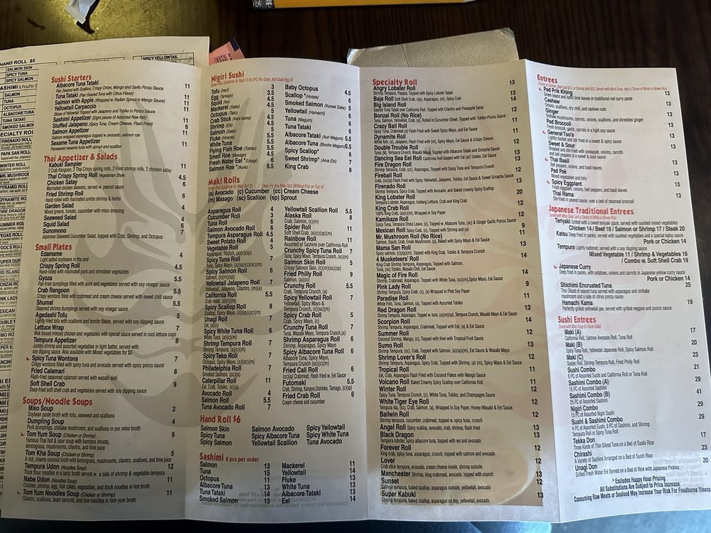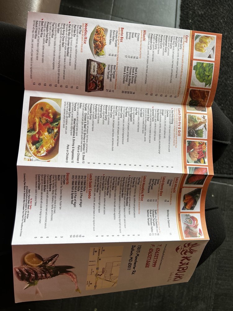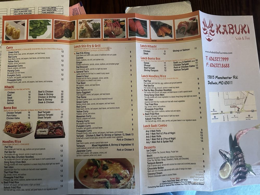 Introducing the menu at Kabuki Sushi & Thai, located in Ballwin, MO. This restaurant offers a variety of sushi starters, including Albacore Tuna Tataki, Tuna Tataki, Salmon with Apple, Yellowtail Carpaccio, and Sashimi Appetizer. Their Thai appetizers and salads feature favorites like the Kabuki Sampler, Thai Crispy Spring Roll, Chicken Satay, Fried Shrimp Roll, Garden Salad, and Seaweed Salad. For small plates, guests can enjoy Edamame, Crispy Spring Rolls, Gyoza, Crab Rangoon, and Shumai. Customers rave about the pleasant ambiance and flavorful dishes, with options for vegans and vegetarians. The restaurant also offers takeout, delivery, and catering services. Don't miss out on the opportunity to try their specialty rolls and seasonal menu items!